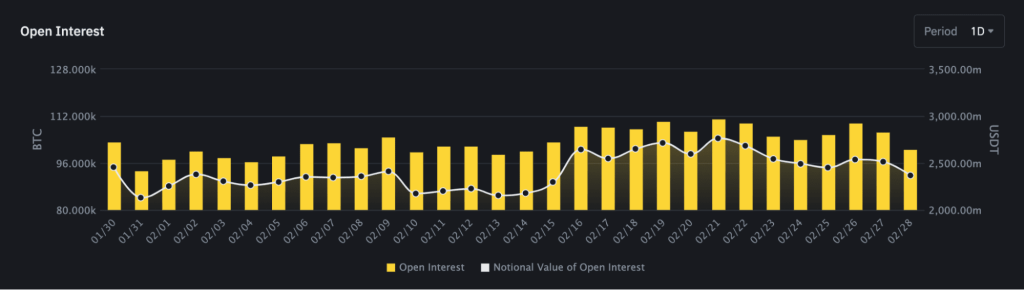 • On Binance Futures, the BTCUSDT Open Interest closed the week on February 26 at about 2.48% higher than at the beginning of week on February 20.